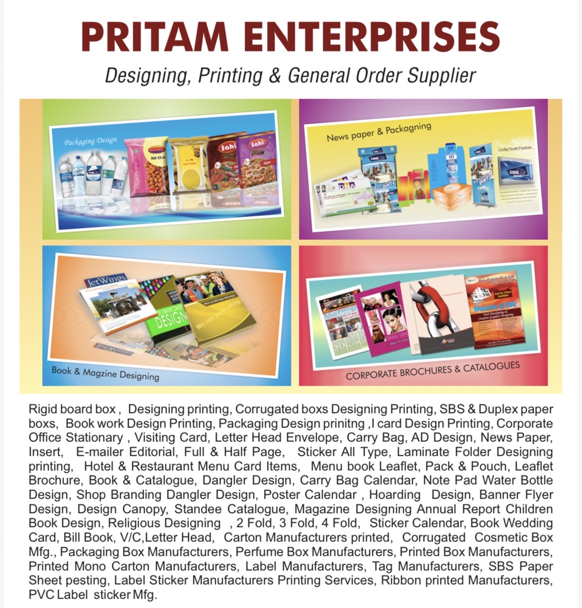 PRITAM ENTERPRISES offers complete printing, packaging, and branding solutions. From rigid boxes to corporate stationery, labels, hoardings, and promotional materials, we deliver creative designs, superior quality printing, and timely service to help your brand stand out effectively.